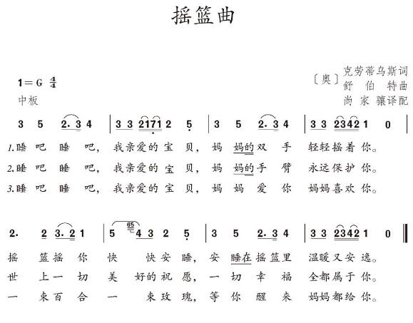 摇篮曲也象船歌一样,既有声乐作品,又有器乐作品。6/8拍子也是摇篮曲的典型节拍。如下面的一首6/8拍子的声乐摇篮曲,作曲者据说是莫扎特。这首歌是以一个两小节的短小旋律作为主题核心发展而成的,音调明朗热诚,充满对孩子未来的希望。描写摇篮轻轻摆动的节奏,从头贯穿到底。歌中唱道:睡觉吧,我的宝贝,小蜜蜂已经休息,小鸟儿也已回巢,花园里多么安温。月亮在天上微笑,一片银光多美丽,透过窗户照着你,睡觉吧,我的宝贝,快睡,快睡! 除了6/8拍子的摇篮曲外,三拍子和四拍子的摇篮曲也都可以利用和声和节奏的手法,来描写摇篮的摆动。舒伯特的《摇篮曲》是利用稳定和弦和不稳定和弦的不断交替,来体现摇篮摆动的效果的。这是一首民歌风格的歌曲,音乐充满无限的温存和抚爱。勃拉姆斯的《摇篮曲》是通过强弱拍节奏的起伏。来塑造摇篮摆动的形象的。这也是一首民歌风格的歌曲,曲调温柔美丽,表现了母亲对孩子的亲切祝愿:晚上好,夜里好,玫瑰花、丁香花都已闭上眼,你也快睡觉。到明天,大清早,又是会说会跳。晚上好,夜里好,天使在守卫你,睡吧,圣婴树会在梦里出现。睡得香,睡得甜,你会梦见乐园。